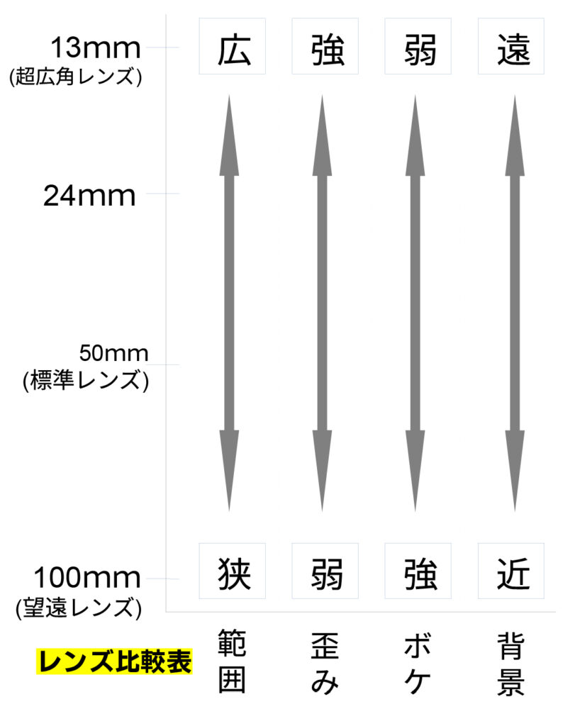 焦点距離にはそれぞれ特性があり以下が代表的なものとなります。